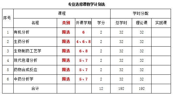 专业课共10门,860学时,4学分,开设:药用植物学、生药学、中医药学基础、药理学、药事管理学、药物化学、药物分析、体内药物分析、药剂学、生物药剂学与药代动力学、天然药物化学。