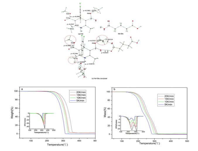 Fig.2 The molecular graphs and relative electron densities at the BCPs and TG/DTG curves of Fel and its cocrystal at different heating rates: (a) intact Fel; (b) Fel?CGlu cocrystal.