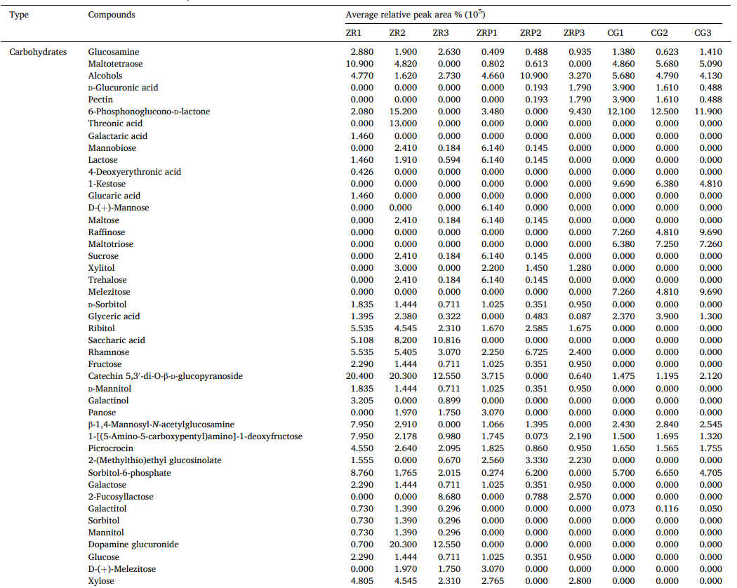 为了进一步探讨不同品种间差异的机制,我们对差异表达的代谢物进行了分析。我们的分析发现,无论是ZR-ZRP组还是ZR-CG组,差异代谢物中都含有大量的碳水化合物,如氨基葡萄糖、糖酸、半乳糖醇、山梨醇、甘露醇、麦芽三糖、鼠李糖、1-酮糖和木糖。根据研究,碳水化合物具有多种生物活性,包括抗氧化、免疫调节、抗炎、伤口愈合和抗糖尿病活性,这可能表明加工后的ZR味道和药理作用均发生了变化。在ZR和ZRP的差异中,有机酸和苯丙烷是第二大类。有机酸被认为是食物香气形成和酸味甜味的重要贡献者,它们还具有增加食欲和促进消化的功能。这一结果可能表明ZR和ZRP在气味、味道和食品应用方面的差异。维生素是一种具有多种基团的有机物质,由区别于ZR和ZRP的差异代谢物组成,在疾病预防和人类健康中发挥着至关重要的作用。其中,抗坏血酸,又称维生素C,对心血管和神经退行性功能障碍等多种疾病具有重要的生理抗氧化作用,这也为在保健功能和营养应用中区分ZR和ZRP提供了新的思路。