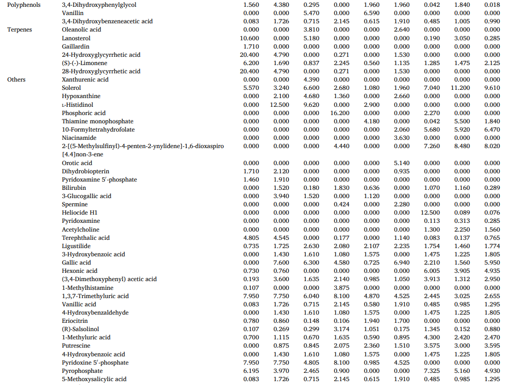 本研究采用基于Q-TOF SWATH的靶向代谢组学方法,全面剖析ZR、ZRP和CG的营养成分,阐明ZR加工过程中代谢产物的修饰多样性。我们共检测到369种代谢物,分为14类(表1),包括碳水化合物、核苷酸、有机酸、维生素、脂类、黄烷酮、儿茶素、醇、吲哚、生物碱、苯丙烷、多酚、萜类和其他代谢物。所获得的碳水化合物、有机酸、维生素、脂质、醇、苯丙烷和其他代谢物的文献与以前的报道一致,表明本研究所使用的方法具有良好的适用性和准确性。其中,ZR、ZRP和CG样品中分别检出316种、314种和200种成分。根据堆积条形图(图1C)上显示的所有代谢物的百分比含量,ZR的代谢物经过处理后都有不同程度的减少。通过对不同物种代谢物的定量分析,碳水化合物、核苷酸、有机酸、维生素、脂类、吲哚类、生物碱和萜类在加工后呈下降趋势,而儿茶素不同于这些类别,加工后呈上升趋势。值得注意的是,黄烷酮、苯丙烷和多酚类物质在ZRP中含量最高,醇类化合物在CG中含量最高。