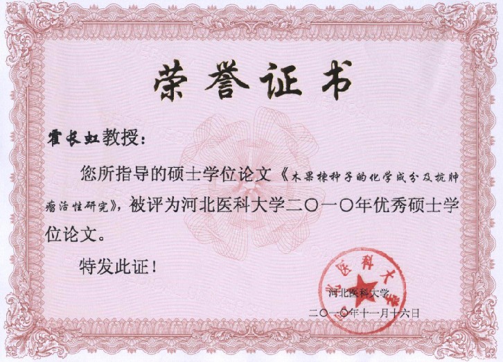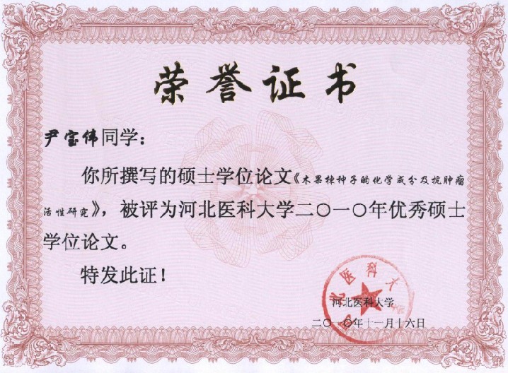 我室霍长虹教授指导的硕士研究生尹宝伟的学位论文《木果楝种子的化学成分及抗肿瘤活性研究》,被评为蜜桃视频 2010年优秀硕士学位论文。