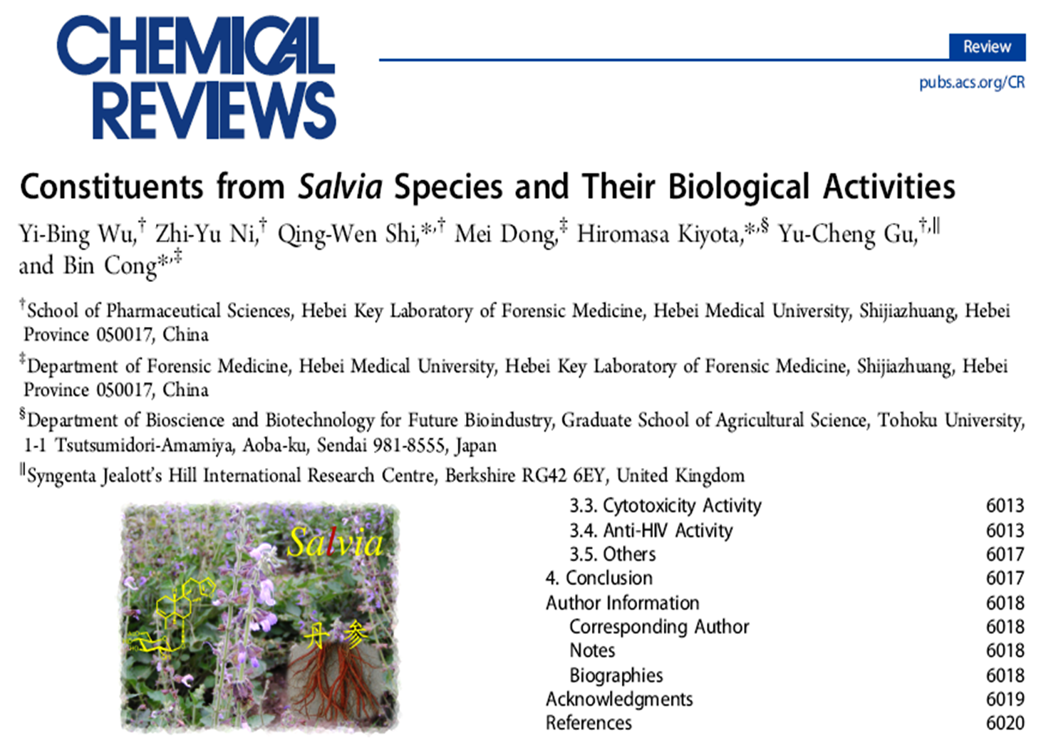 1. Yi-Bing Wu, Zhi-Yu Ni, Qing-Wen Shi, Mei Dong, Hiromasa Kiyota, Yu-Cheng Gu, and Bin Cong Constituents from Salvia Species and Their Biological Activities. Chemical Reviews.2012,112(11), 5967-6026 (IF=40.197)