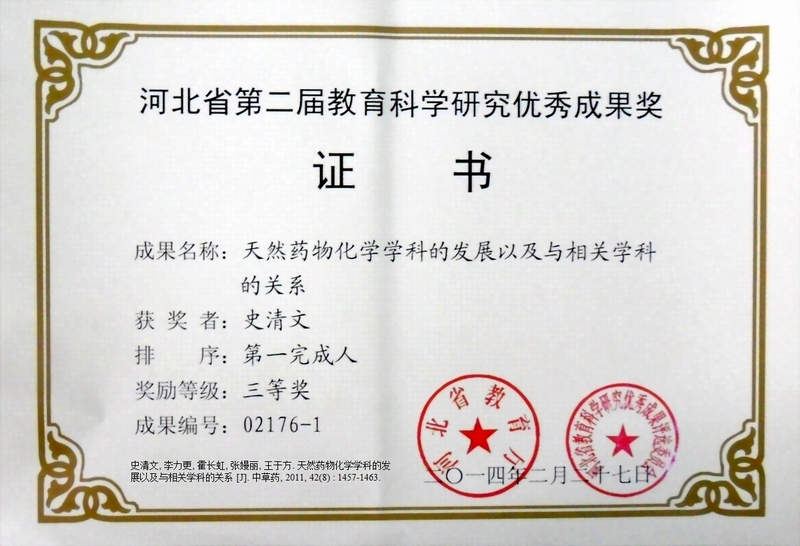 我室审报的获奖论文成果是《天然药物化学学科的发展以及与相关学科的关系》,完成人:史清文,李力更,霍长虹,张??丽,王于方。