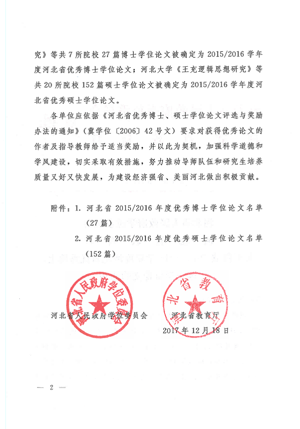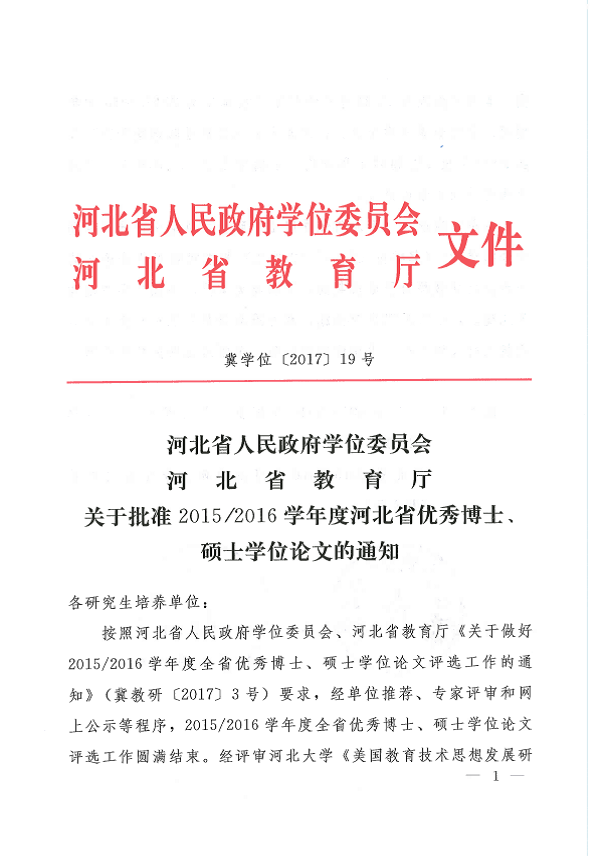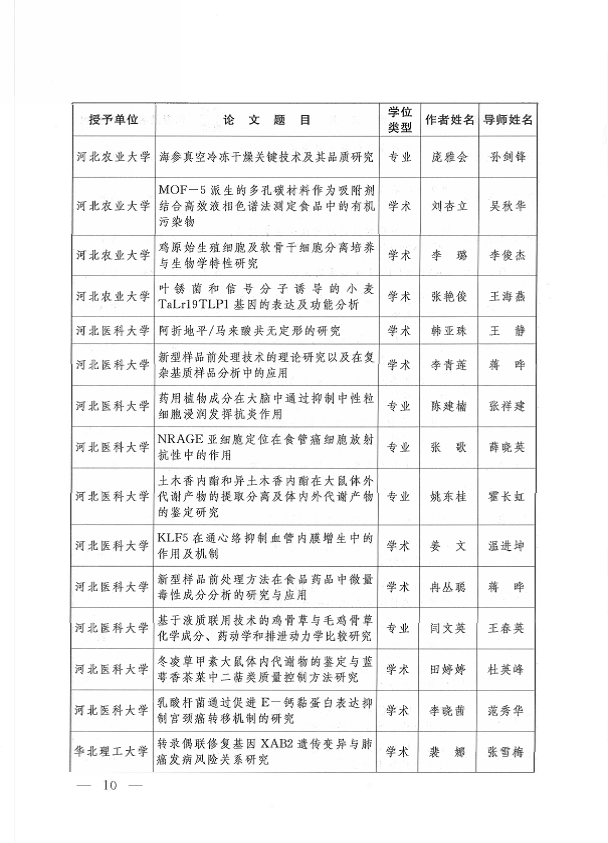 我室硕士研究生毕业论文获河北省优秀硕士论文