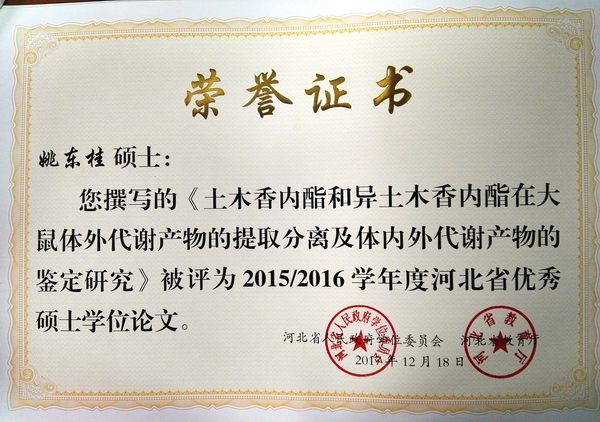 由我室 霍长虹 教授指导的2013级硕士研究生姚东桂撰写的毕业论文《土木香内酯和异土木香内酯在大鼠体外代谢产物的提取分离及体内外代谢产物的鉴定研究》被评为蜜桃视频 2015-2016学年度优秀硕士学位论文、河北省优秀硕士学位论文。