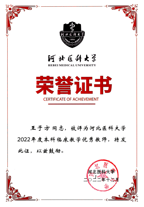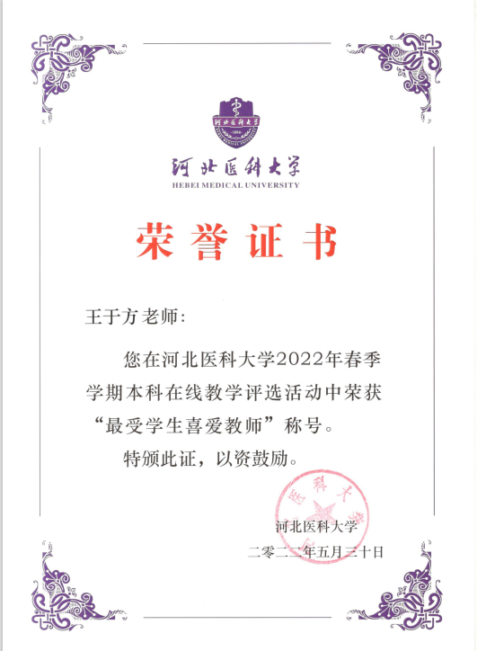 我室王于方老师荣获“蜜桃视频 在线教学最受学生喜爱教师”及“本科临床教学优秀教师”称号。这是我室在本科生教学中继微课大赛、化学大赛等之后的又一佳绩。